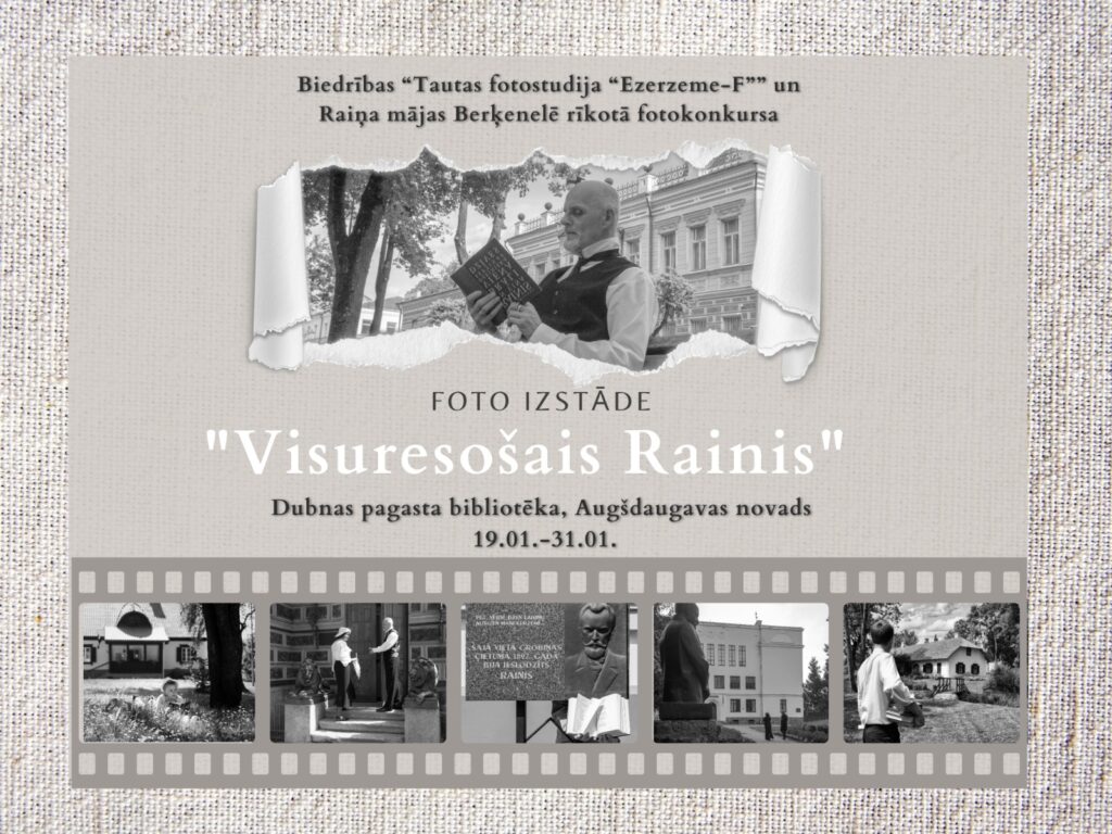 2025. gadā, svinot izcilā dzejnieka un domātāja Raiņa 160 gadu jubileju, Tautas fotostudija Ezerzeme – F sadarbībā ar Raiņa māju Berķenelē rīkoja foto konkursu “Visuresošais Rainis”, aicinot fotogrāfus no dažādiem Latvijas novadiem radoši izcelt šo nozīmīgo gadadienu. Fotogrāfi devās Raiņa pēdās, apzinot vietas, kur dzejnieks ir dzīvojis, strādājis, ceļojis vai apmeklējis iestādes, kas saistītas ar viņa personību un darbu. Konkursa mērķis bija izcelt šīs vietas un tajās notiekošo mūsdienīgā skatījumā, izmantojot Raiņa tēlu dažādos viņa dzīves posmos – gan kā dzejnieku, domātāju un sabiedrisko darbinieku, gan kā cilvēku ar savu iekšējo pasauli un laikmeta kontekstu.